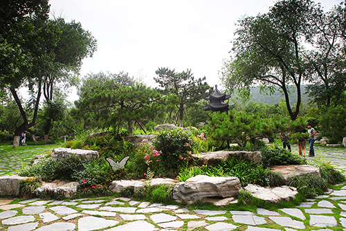 特别是鹄鸣谷,充分利用原有地形,在制高点建立六角重檐亭,即珠山亭,形成全区的观景点,地面用80mm厚的灰石板自然面乱铺,缝隙50mm左右,中间种植草皮,通过增加其他的植物配置,与原有的榆树、法桐等大树一起,形成古朴、清幽、自然的原生态景观群落,成为景区中的一大亮点。