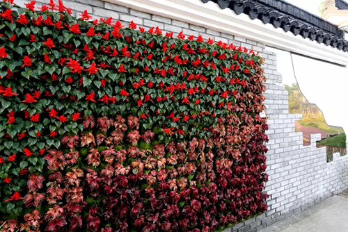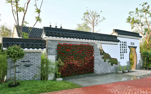 考虑到银川的干燥气候,垂直绿化墙植物的保湿成为难题。“浙江园”垂直绿化墙以无纺布为墙体材料,使用保湿性强的基质,优选植物种类,同时搭配滴灌系统,保证了绿化墙鲜花拥簇的景象。展园内的垂直绿化墙设计简洁、曲线优美,与以钱塘江文化为主题的背景墙相互映衬,共同展现了新时期浙江园林景观的不断发展与创新。