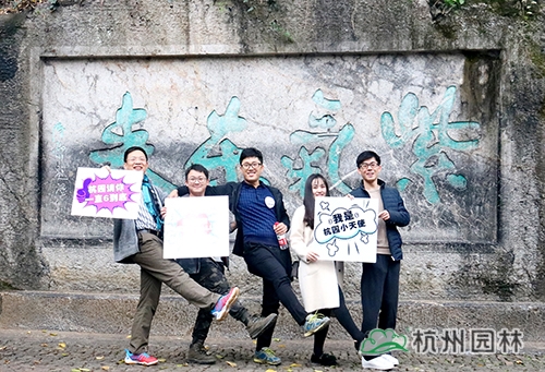 第二个任务点在紫气东来石碑。大家在紫气东来石碑前的平台区域用“杭州园林”的元素进行合影、点赞,即可盖章过关。紫气东来石碑是玉皇山的标志性位置,大家在这里合影留念,成为“杭园小天使”,“为杭园打call”,玩的不亦乐乎。