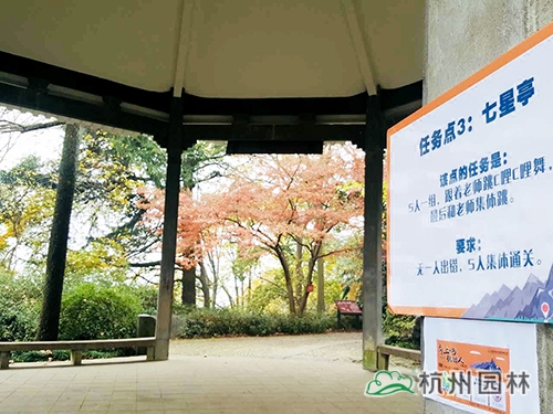 本次活动的终点为玉皇山顶的“江湖一览阁”。玉皇山是杭州绝佳的观秋景高地,站在山顶,可俯瞰杭州全城,八卦田的神秘、西湖的绚丽等尽收眼底;山上则是古树参天,红叶似火,黄叶赛金,彩林岑峦叠峰,如入画里。大家从玉皇山北门上山,途经林海亭、老玉皇宫、樱花地、紫来洞天、七星亭,最后到达山顶的“江湖一览阁”。此次登山途中设立了3个任务点,参加活动人员需要完成相应任务,才能盖章通关。