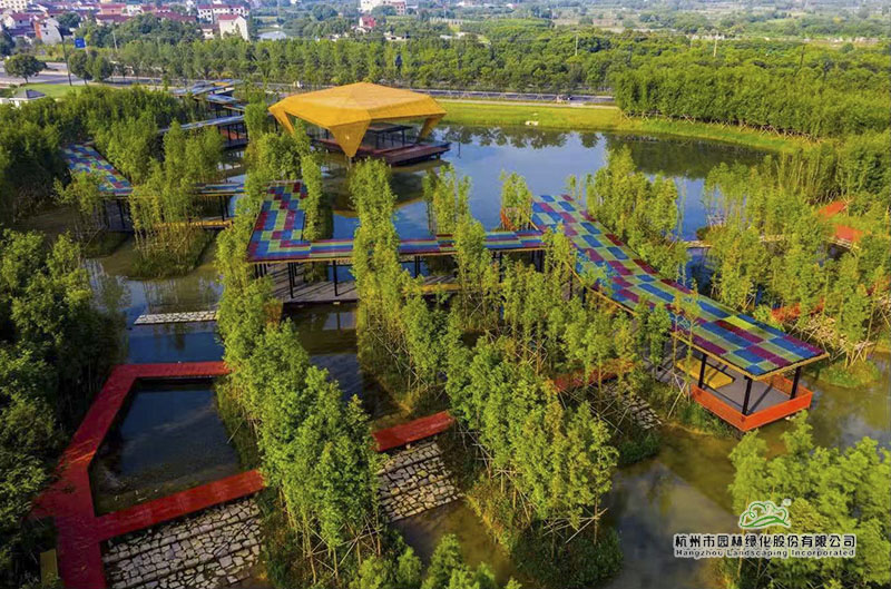 绿道建设充分融入海绵城市理念,从铺装材料的选择到施工过程,均充分体现生态环保,与整个公园景观和谐相融,集生态环保、观赏游玩、休闲运动为一体。沿绿道而行,蜿蜒交错约2公里的空中廊桥,让人体验林中穿梭、空中漫步;‘钻石切割、珍珠光泽’的珍珠凉亭,夜晚,在灯光的折射下,会散发出迷人的光泽,犹如一串闪耀夺目的珍珠,璀璨夺目。从高空俯瞰,红色的绿道在碧水绿树中穿行,将沿途景观有机串连,形成一幅风格鲜明的生态风景画卷。